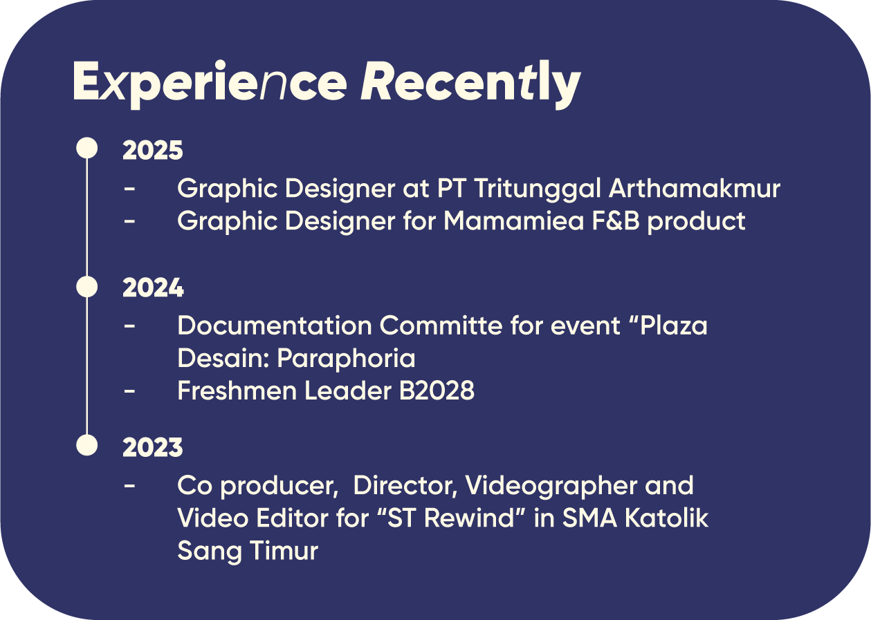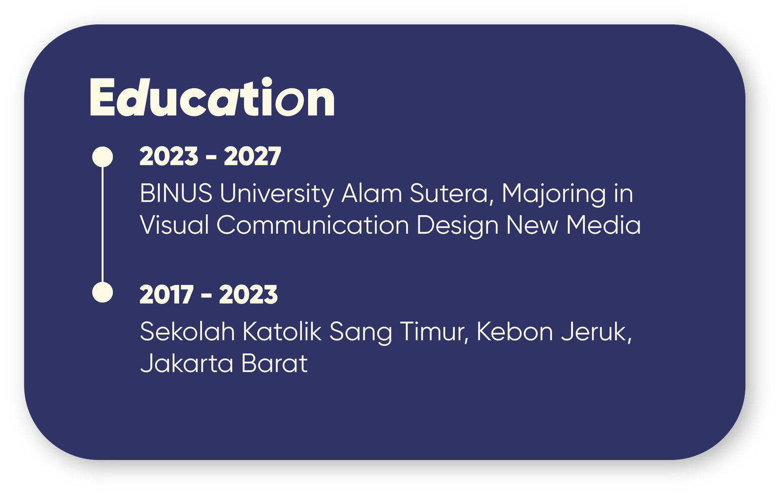 I am an undergraduate Graphic Design student at Binus University, currently in my fifth semester. I have a strong passion for photography, videography, graphic design, and UI/UX. I am a hardworking and enthusiastic individual who always strives to complete every project on time and with the best quality. I enjoy keeping up with the latest design trends, which helps me generate fresh and innovative ideas in my creative work.